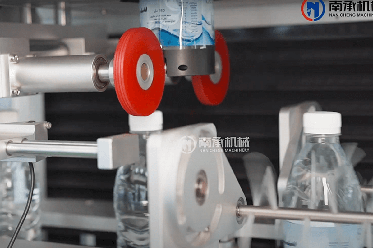 A sleeving machine shoots heat shrinkable plastic sleeves over bottles as they pass by on a conveyor. The sleeves are supplied as lay flats on reels, printed with label information. The fascinating part of a sleeving machine is how it opens the lay flat into a cylinder and then cuts the labels to the correct length at high speed.